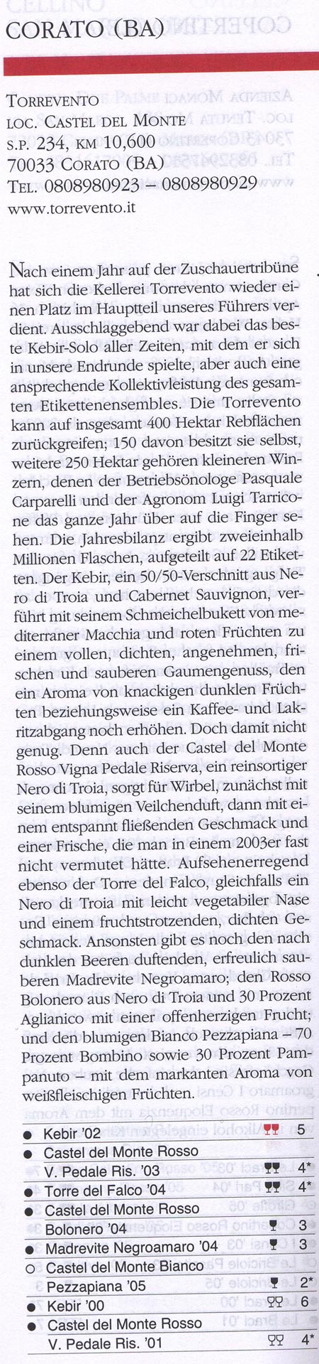 Maroni bewertet in seinem Weinführer 2000 Torrevento sehr gut und